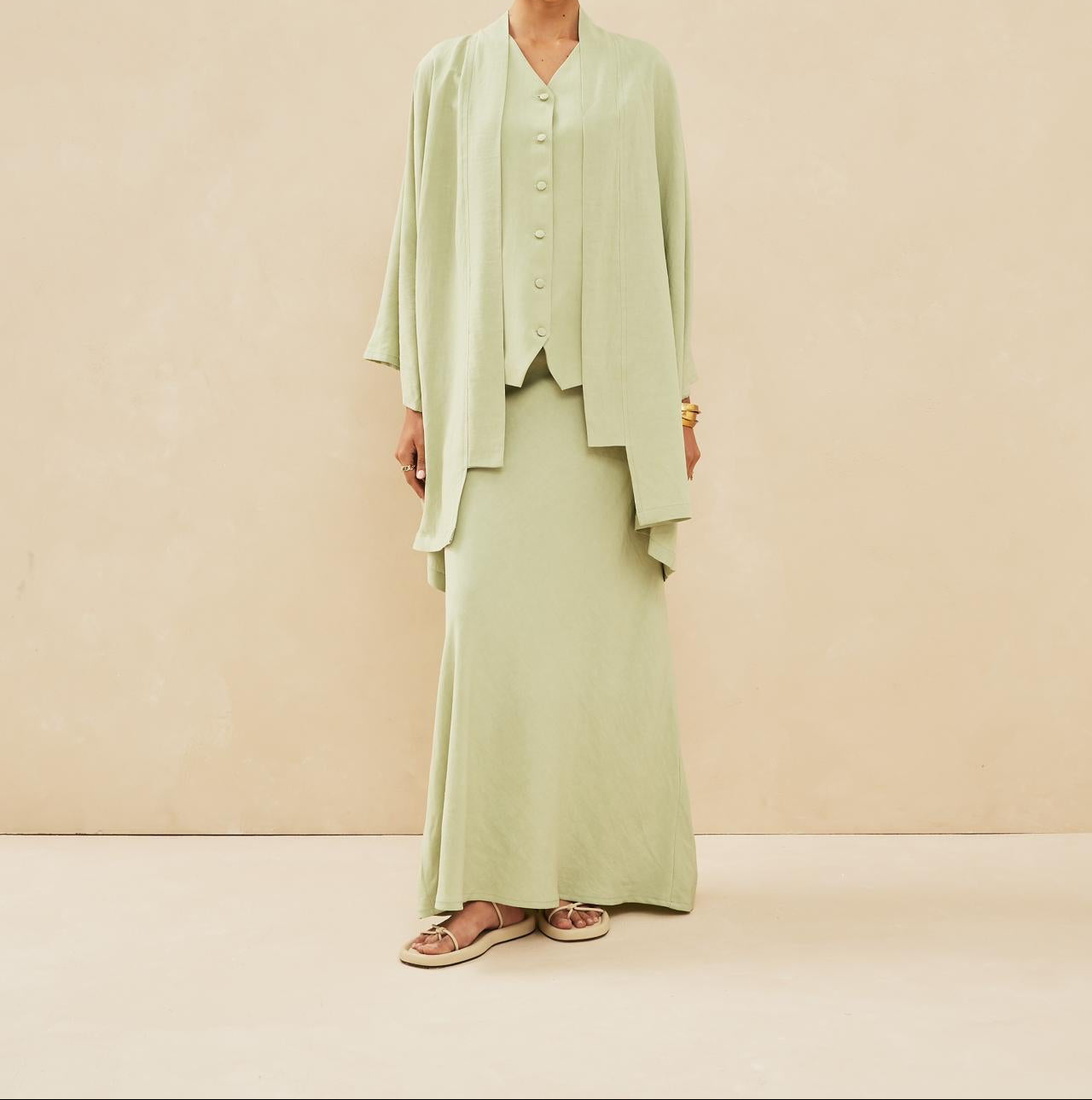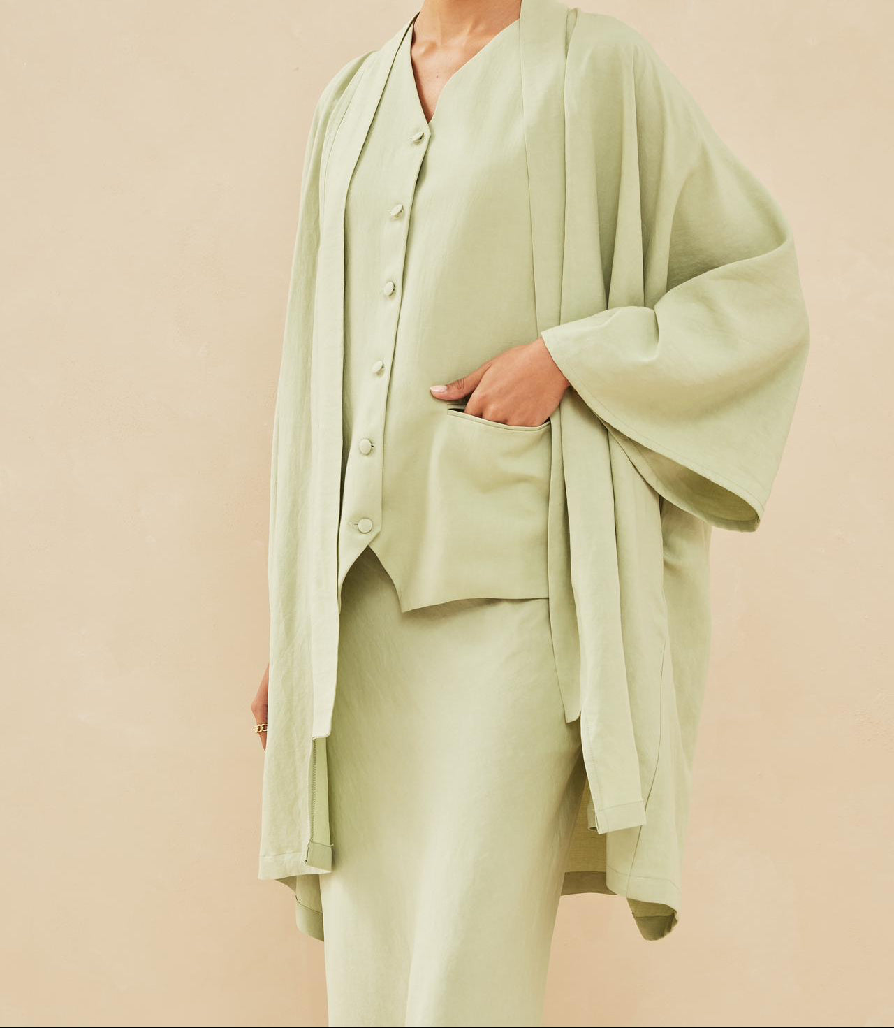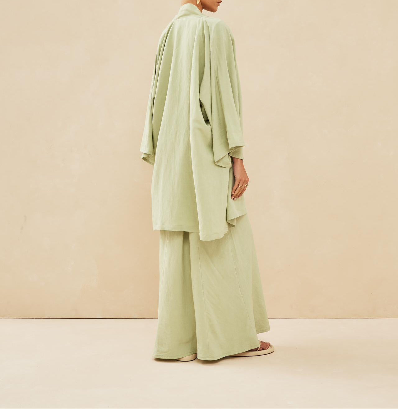 Un sublime kimono court et oversized l'accompagne.